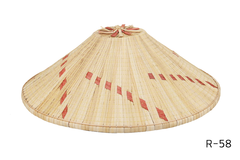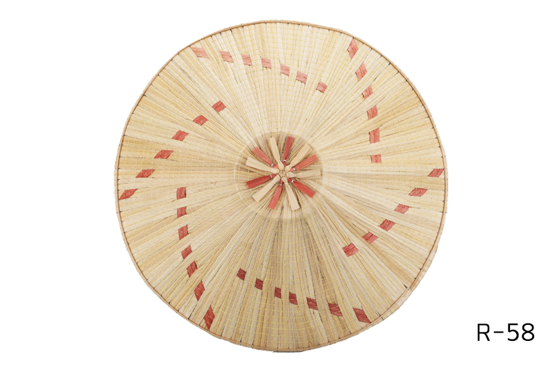 R-11:横模様の笠は、縦のスゲに染めスゲを横に入れるとき縫いながら入れていくので重なるところで苦労します。